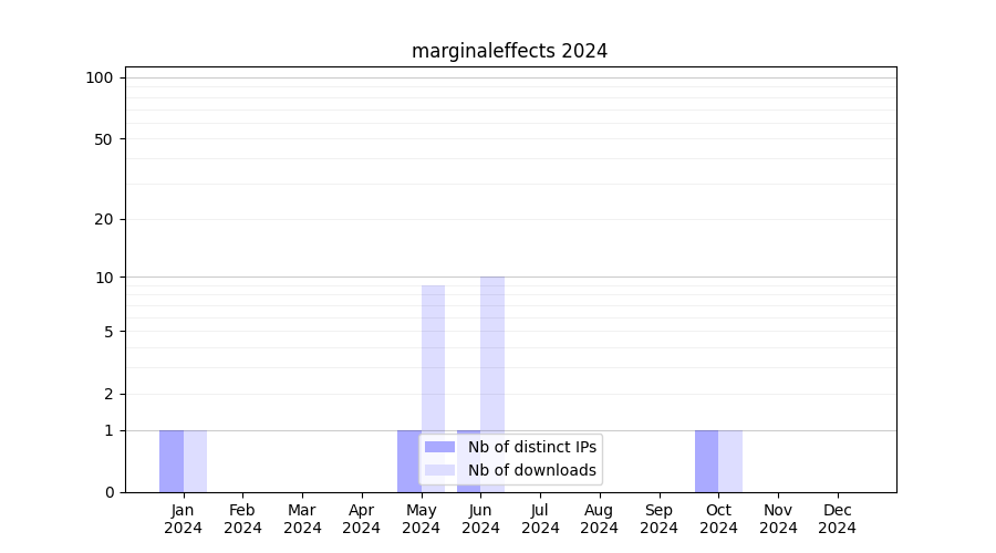 Number of downloads for software package marginaleffects, year by year, from 2025 back to 2014 (years with no downloads are omitted):