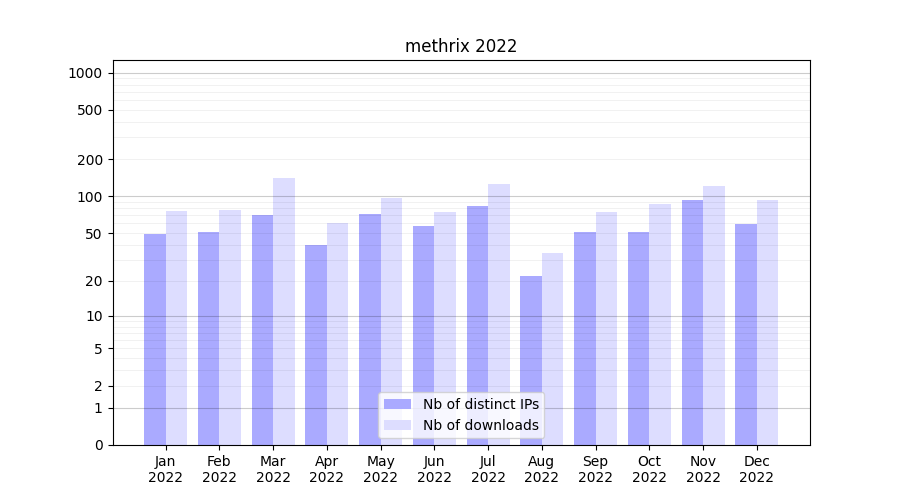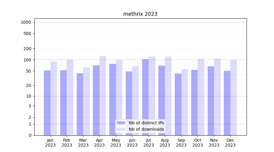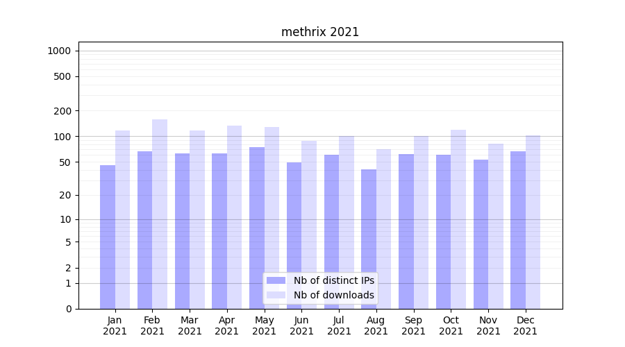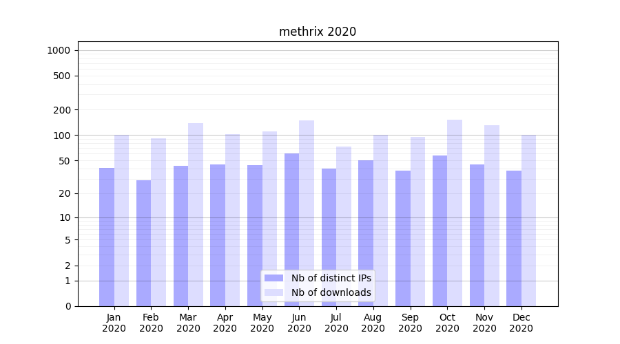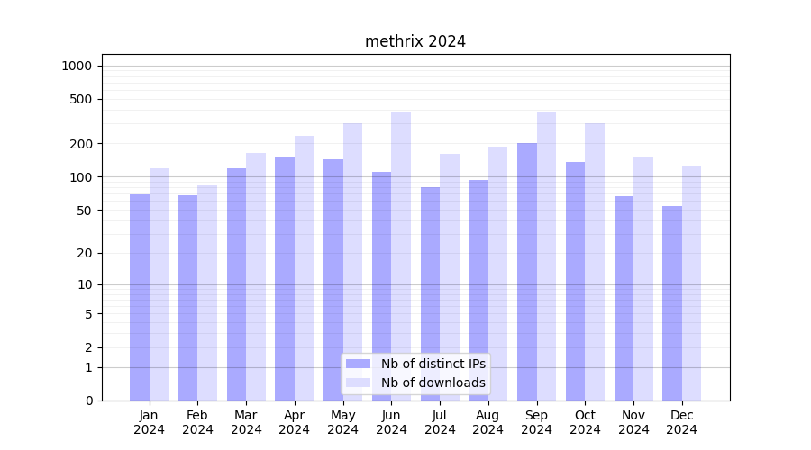 Number of downloads for software package methrix, year by year, from 2025 back to 2014 (years with no downloads are omitted):