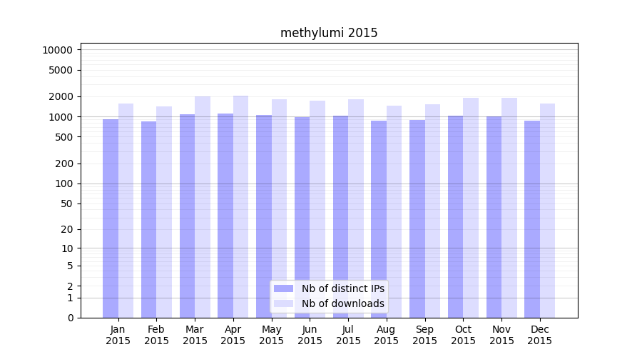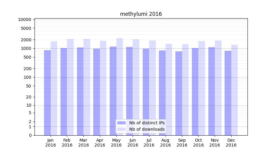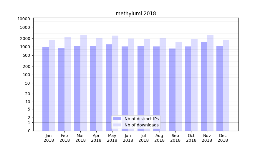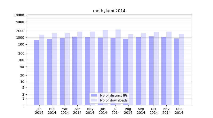 Number of downloads for software package methylumi, year by year, from 2025 back to 2014 (years with no downloads are omitted):