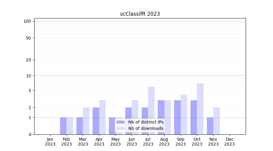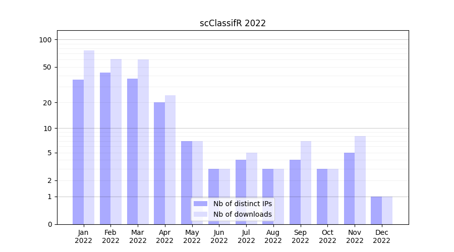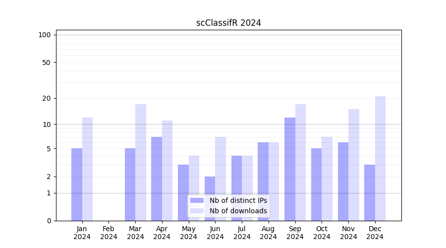 Number of downloads for software package scClassifR, year by year, from 2025 back to 2014 (years with no downloads are omitted):