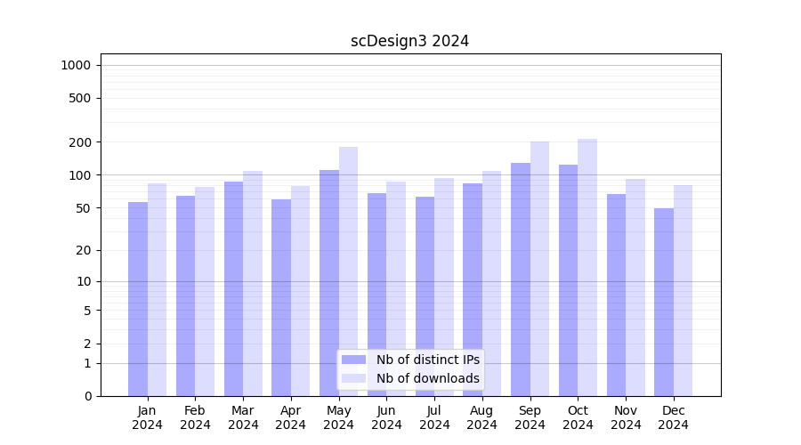 Number of downloads for software package scDesign3, year by year, from 2025 back to 2014 (years with no downloads are omitted):