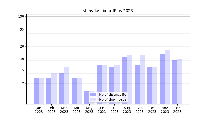 Number of downloads for software package shinydashboardPlus, year by year, from 2025 back to 2014 (years with no downloads are omitted):
