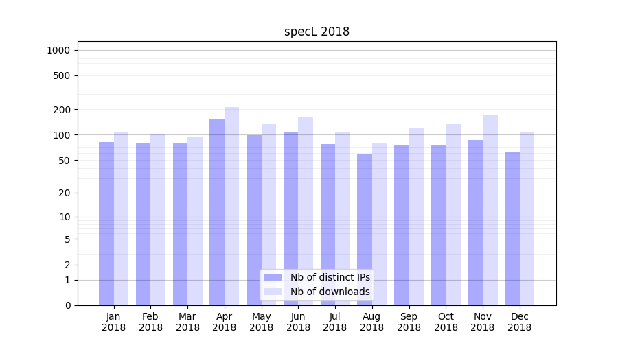 Number of downloads for software package specL, year by year, from 2025 back to 2014 (years with no downloads are omitted):