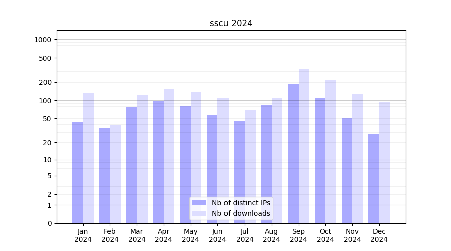 Number of downloads for software package sscu, year by year, from 2025 back to 2014 (years with no downloads are omitted):