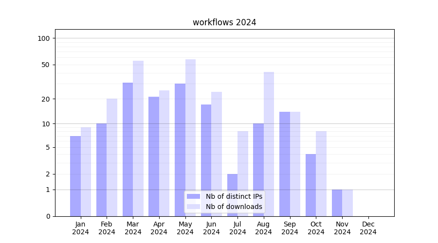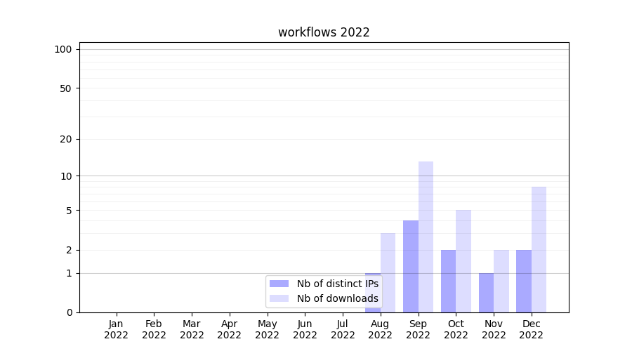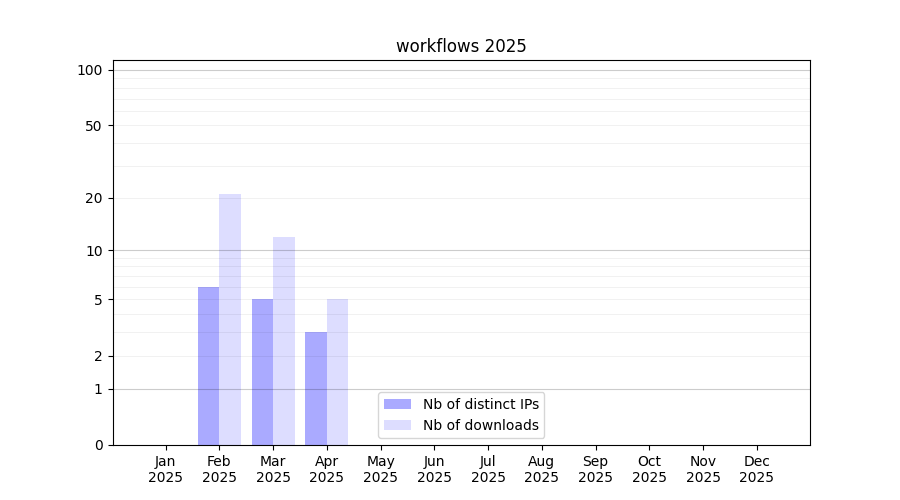 Number of downloads for software package workflows, year by year, from 2025 back to 2014 (years with no downloads are omitted):