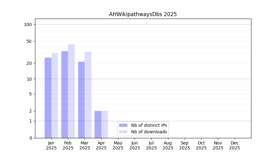 Number of downloads for annotation package AHWikipathwaysDbs, year by year, from 2025 back to 2014 (years with no downloads are omitted):