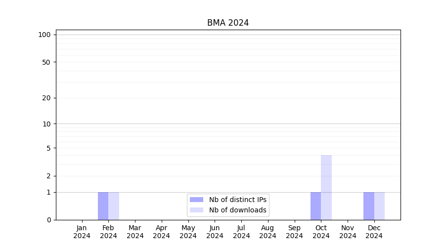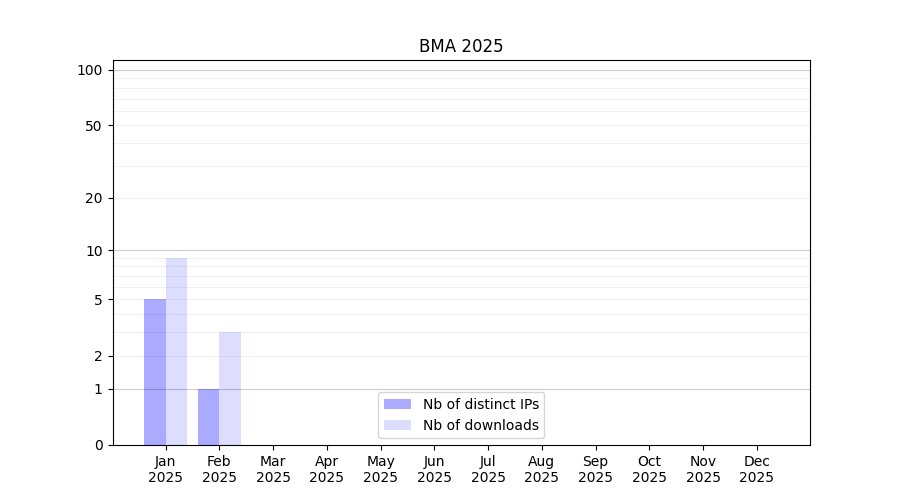 Number of downloads for annotation package BMA, year by year, from 2025 back to 2014 (years with no downloads are omitted):