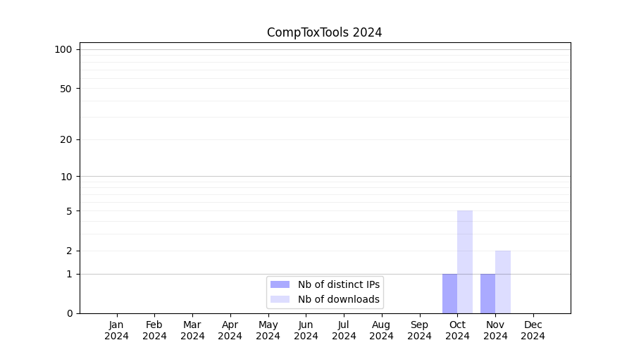 Number of downloads for annotation package CompToxTools, year by year, from 2025 back to 2014 (years with no downloads are omitted):