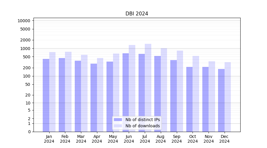 Number of downloads for annotation package DBI, year by year, from 2025 back to 2014 (years with no downloads are omitted):