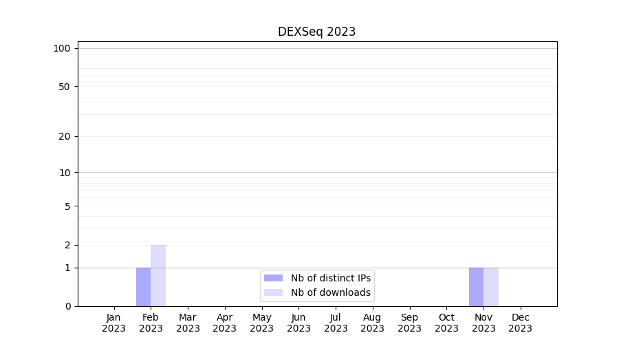 Number of downloads for annotation package DEXSeq, year by year, from 2025 back to 2014 (years with no downloads are omitted):