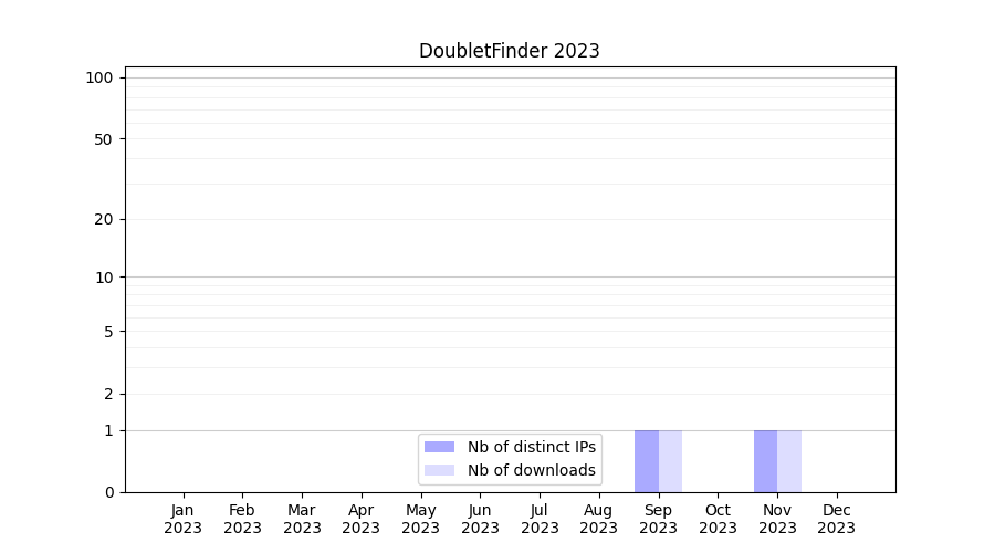 Number of downloads for annotation package DoubletFinder, year by year, from 2025 back to 2014 (years with no downloads are omitted):
