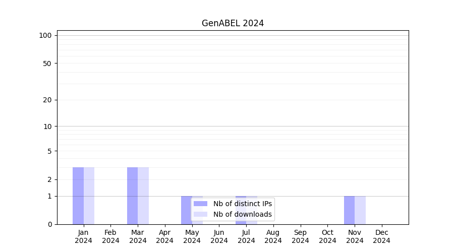 Number of downloads for annotation package GenABEL, year by year, from 2025 back to 2014 (years with no downloads are omitted):