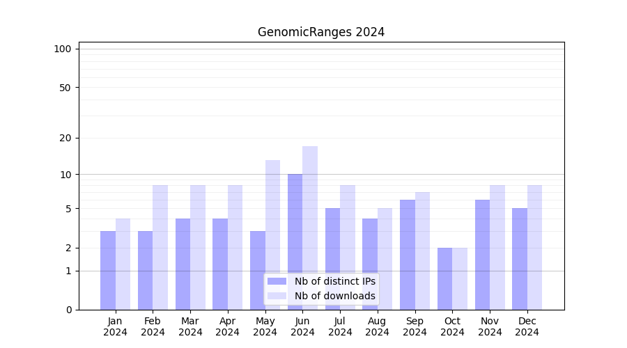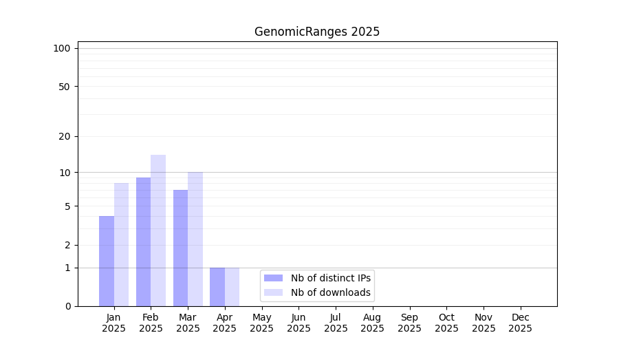 Number of downloads for annotation package GenomicRanges, year by year, from 2025 back to 2014 (years with no downloads are omitted):