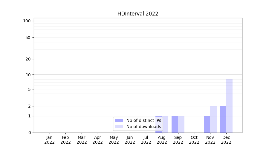 Number of downloads for annotation package HDInterval, year by year, from 2025 back to 2014 (years with no downloads are omitted):