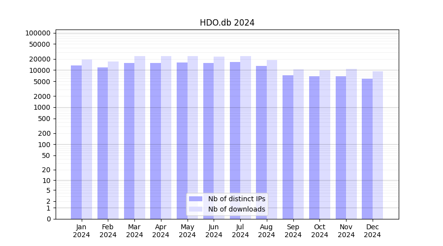 Number of downloads for annotation package HDO.db, year by year, from 2025 back to 2014 (years with no downloads are omitted):