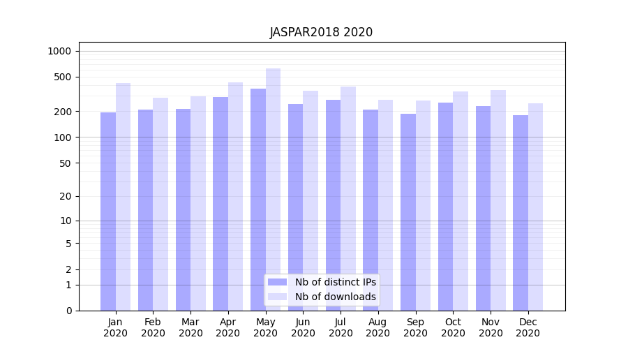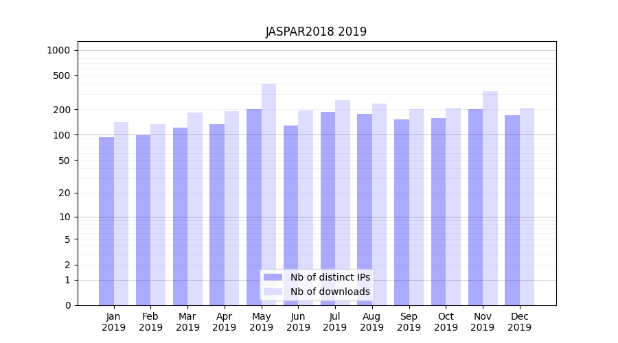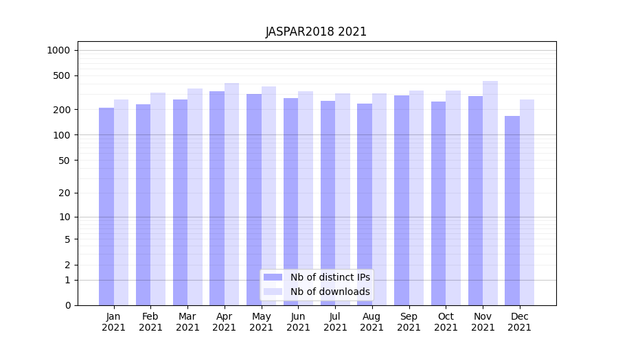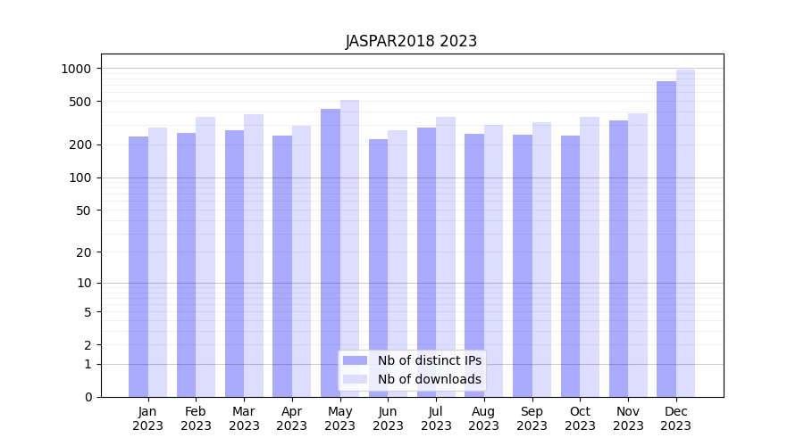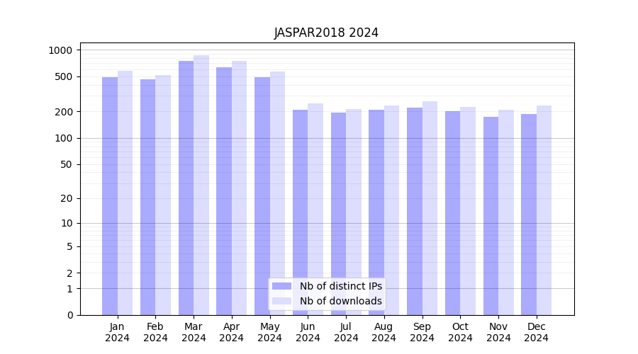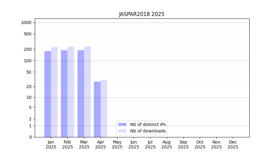 Number of downloads for annotation package JASPAR2018, year by year, from 2025 back to 2014 (years with no downloads are omitted):