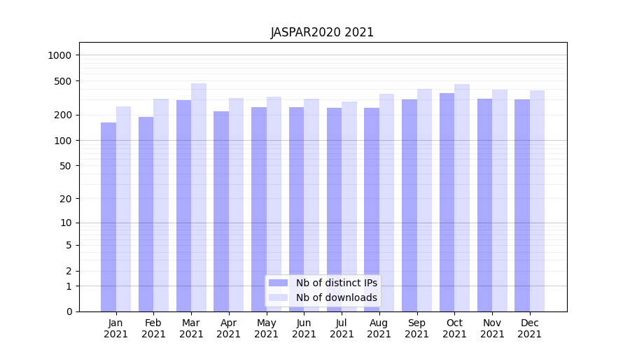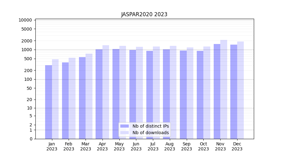 Number of downloads for annotation package JASPAR2020, year by year, from 2025 back to 2014 (years with no downloads are omitted):