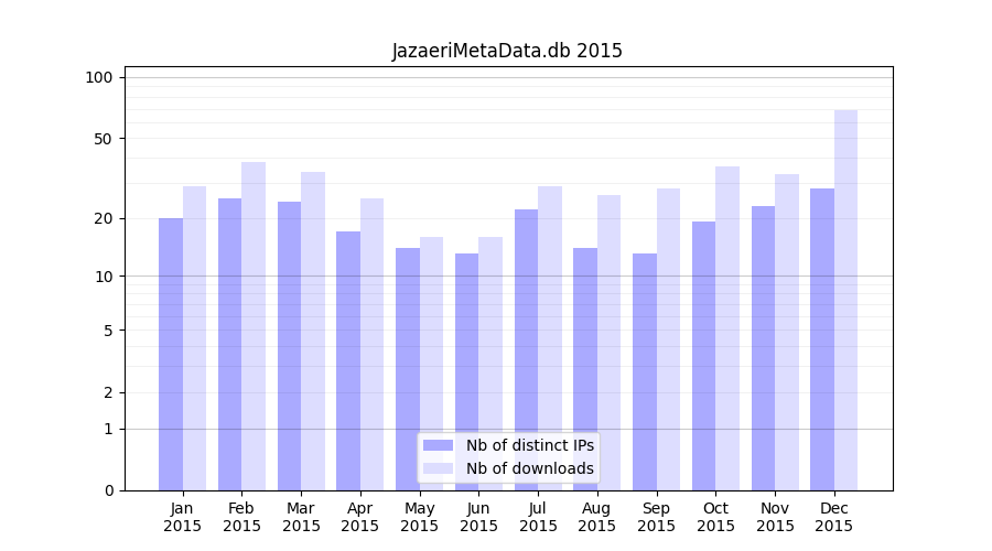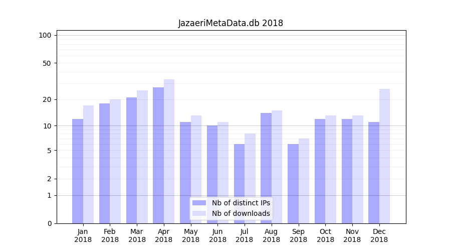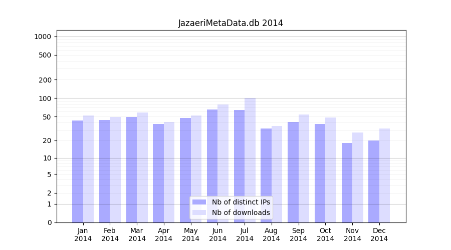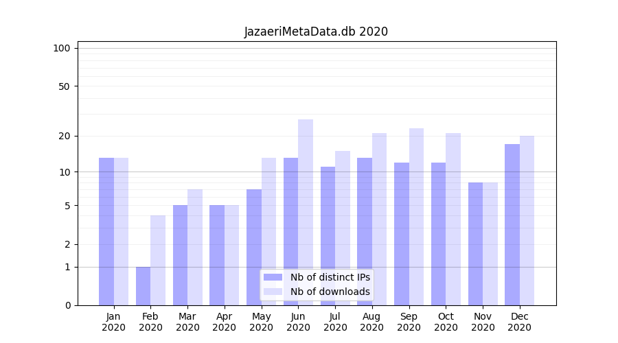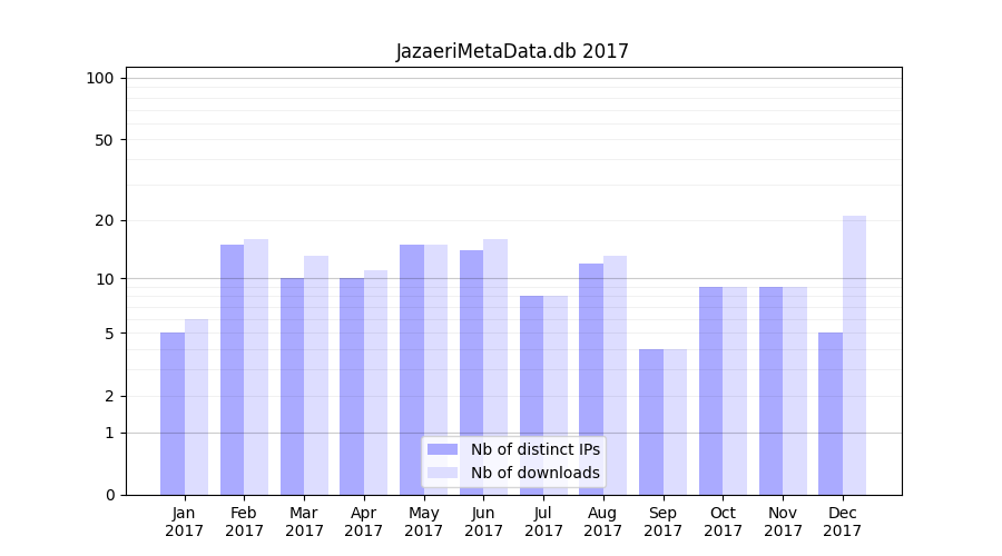 Number of downloads for annotation package JazaeriMetaData.db, year by year, from 2025 back to 2014 (years with no downloads are omitted):