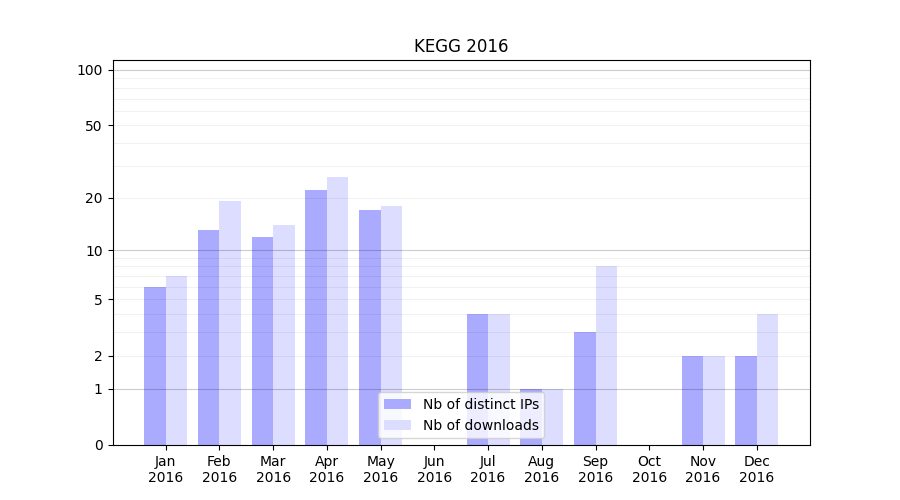 Number of downloads for annotation package KEGG, year by year, from 2025 back to 2014 (years with no downloads are omitted):