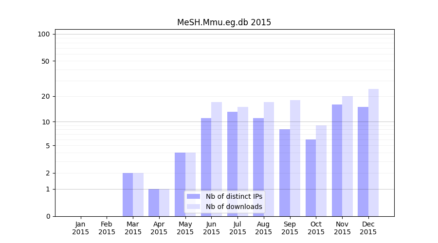 Number of downloads for annotation package MeSH.Mmu.eg.db, year by year, from 2025 back to 2014 (years with no downloads are omitted):
