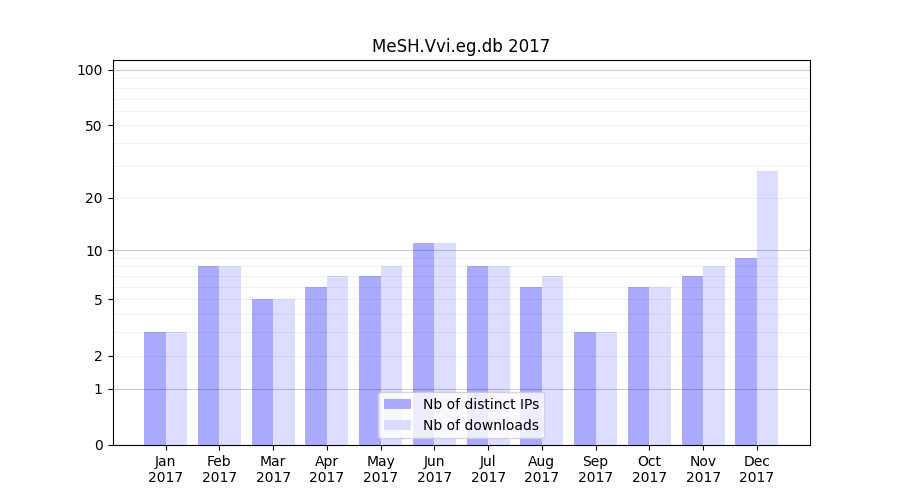 Number of downloads for annotation package MeSH.Vvi.eg.db, year by year, from 2025 back to 2014 (years with no downloads are omitted):