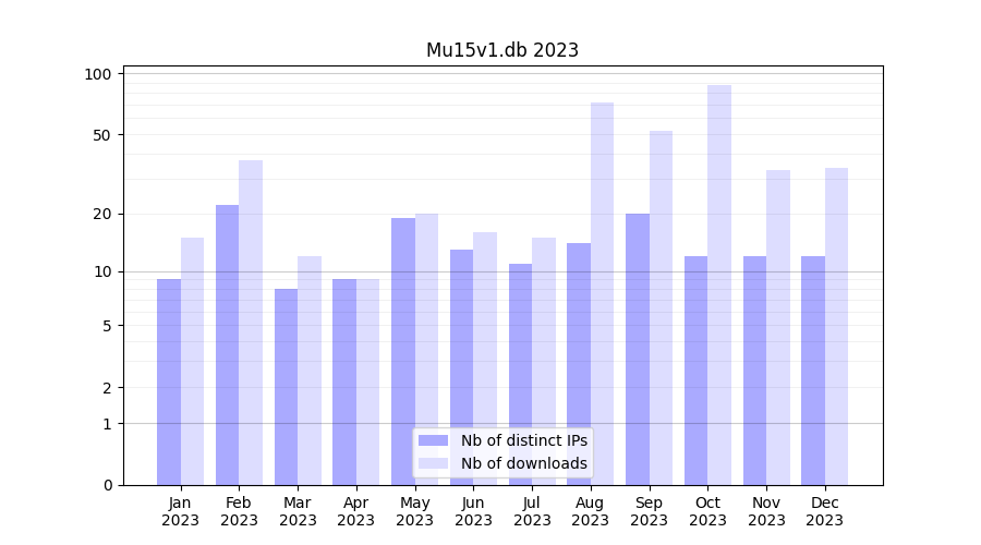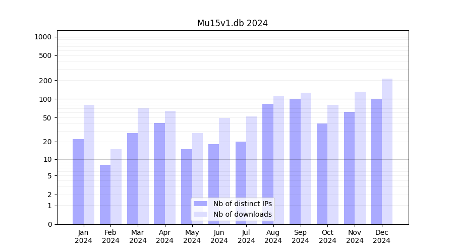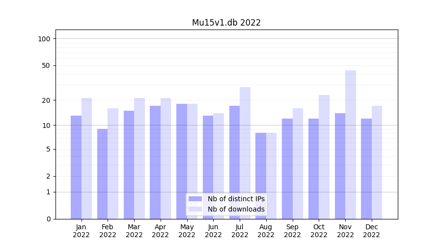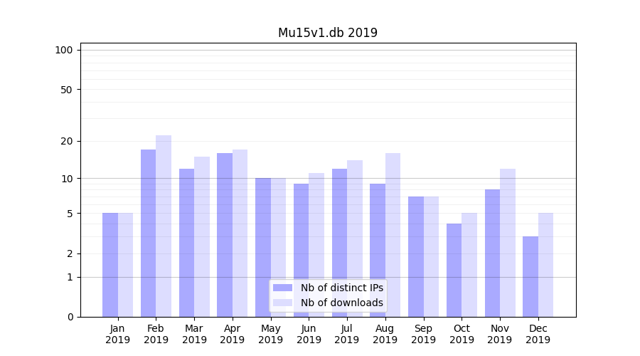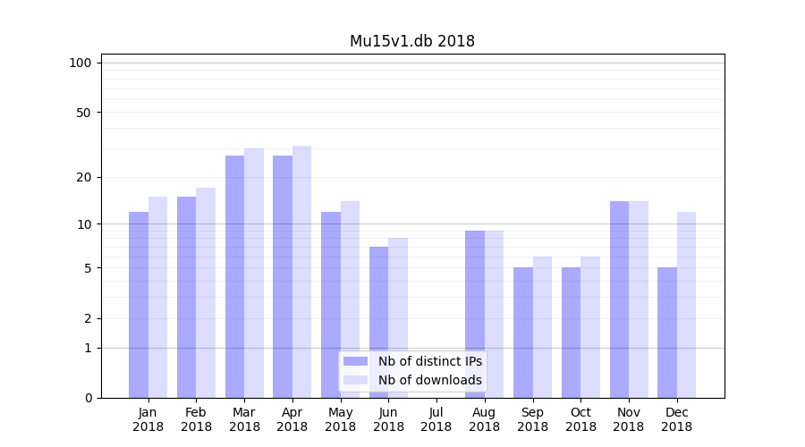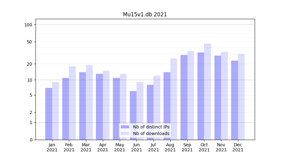 Number of downloads for annotation package Mu15v1.db, year by year, from 2025 back to 2014 (years with no downloads are omitted):