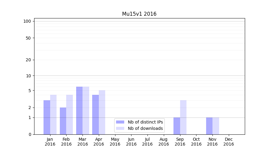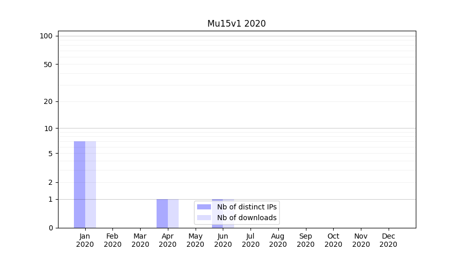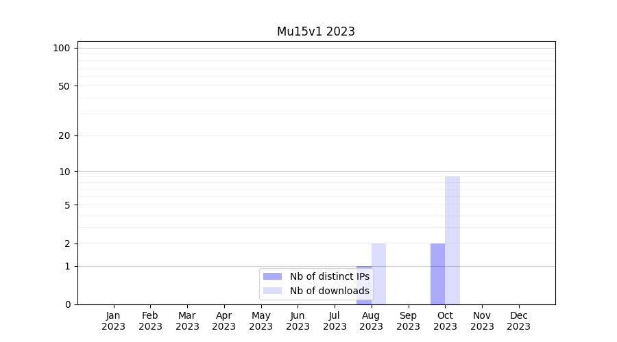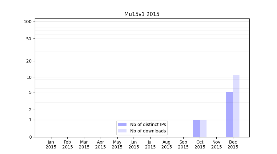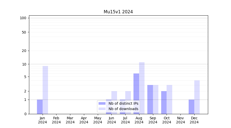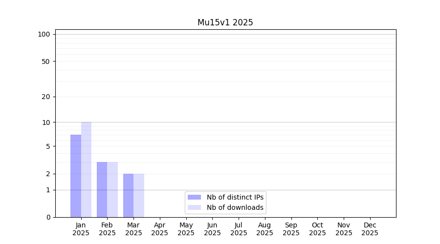 Number of downloads for annotation package Mu15v1, year by year, from 2025 back to 2014 (years with no downloads are omitted):