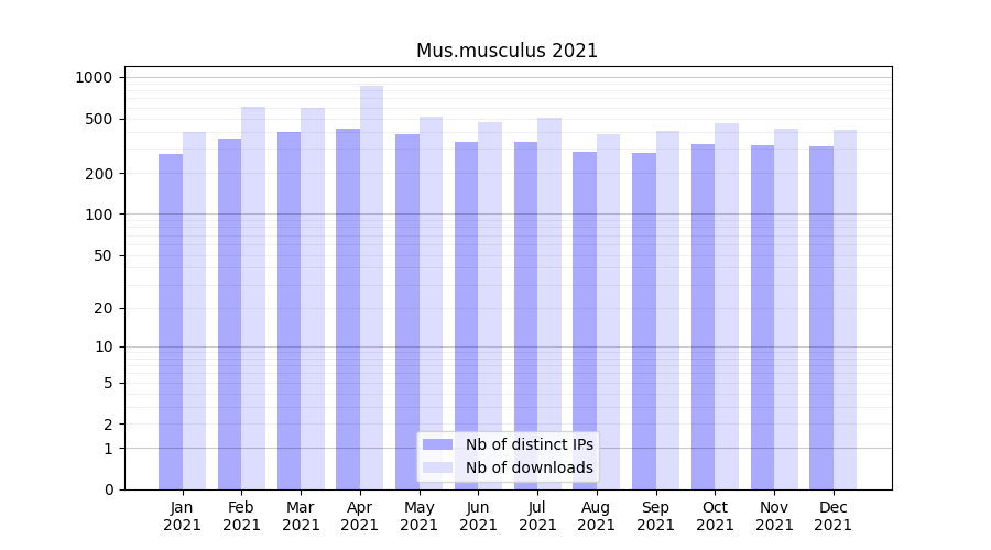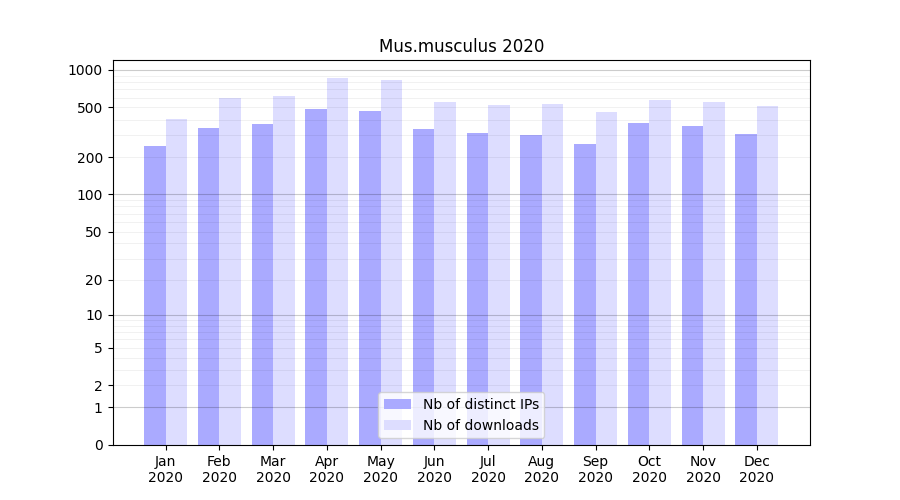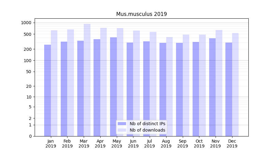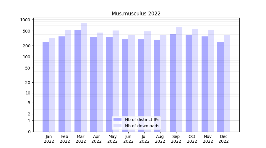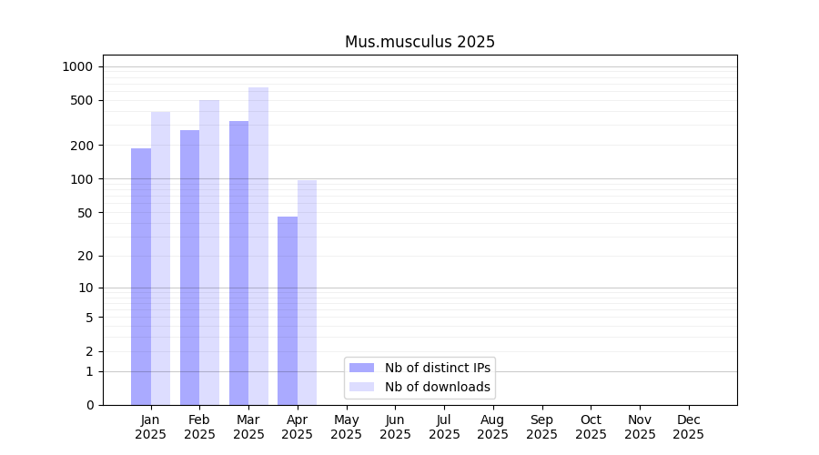 Number of downloads for annotation package Mus.musculus, year by year, from 2025 back to 2014 (years with no downloads are omitted):