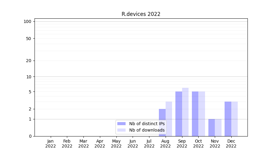 Number of downloads for annotation package R.devices, year by year, from 2025 back to 2014 (years with no downloads are omitted):