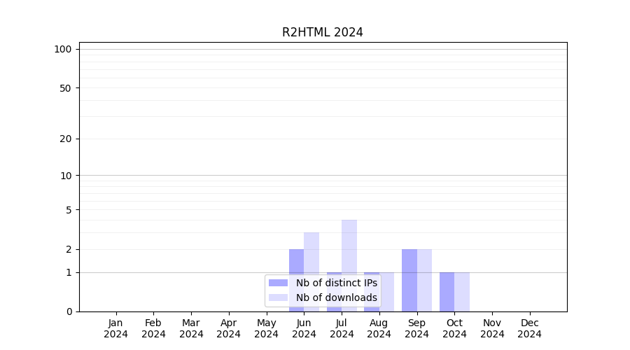 Number of downloads for annotation package R2HTML, year by year, from 2025 back to 2014 (years with no downloads are omitted):