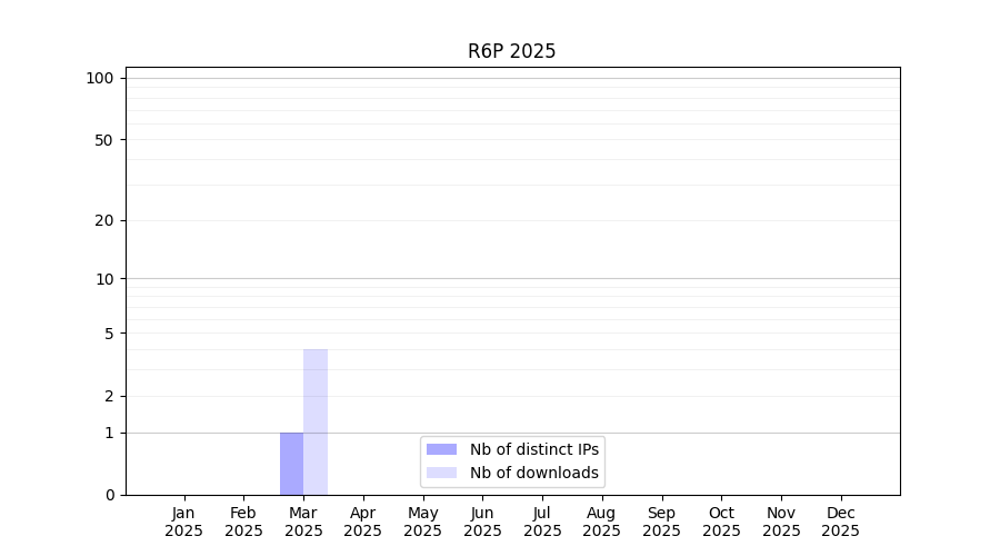 Number of downloads for annotation package R6P, year by year, from 2025 back to 2014 (years with no downloads are omitted):