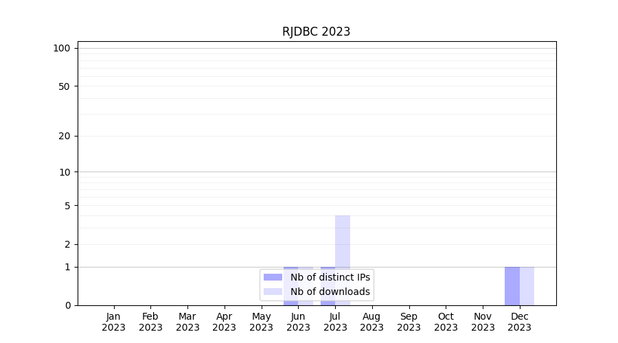 Number of downloads for annotation package RJDBC, year by year, from 2025 back to 2014 (years with no downloads are omitted):