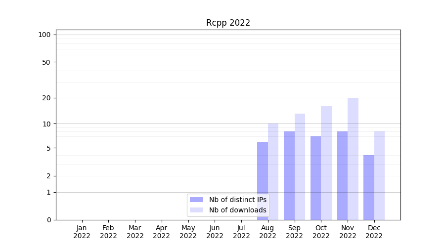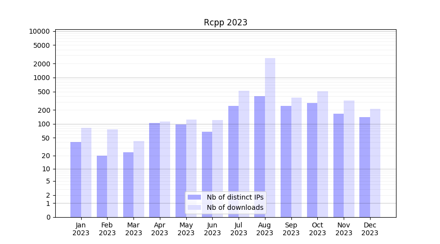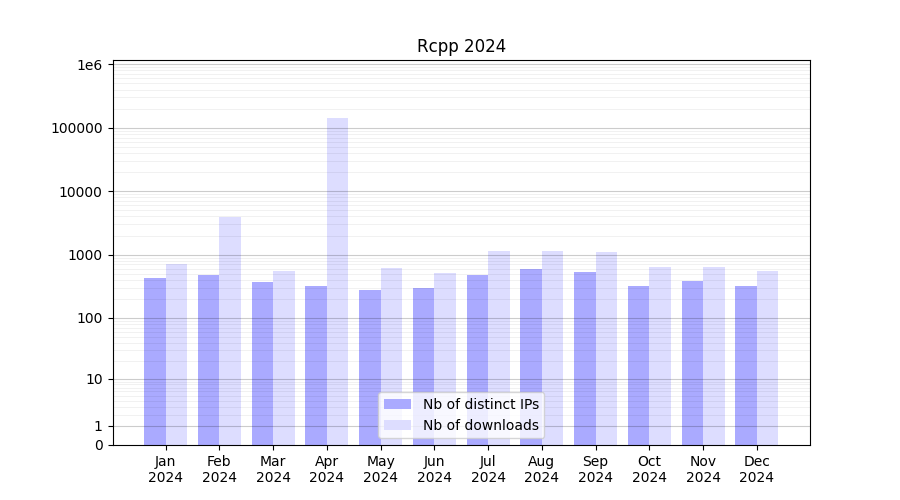 Number of downloads for annotation package Rcpp, year by year, from 2025 back to 2014 (years with no downloads are omitted):