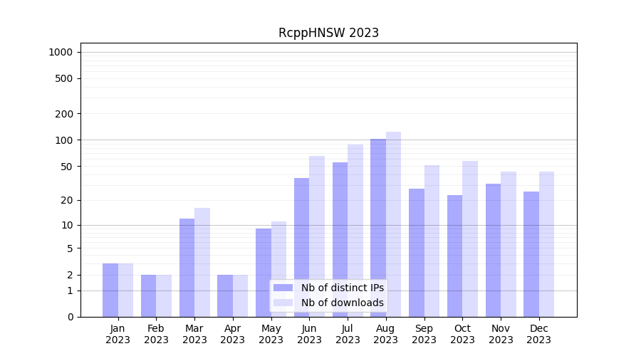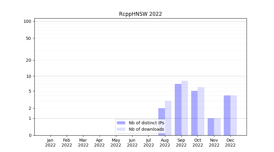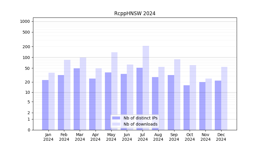 Number of downloads for annotation package RcppHNSW, year by year, from 2025 back to 2014 (years with no downloads are omitted):
