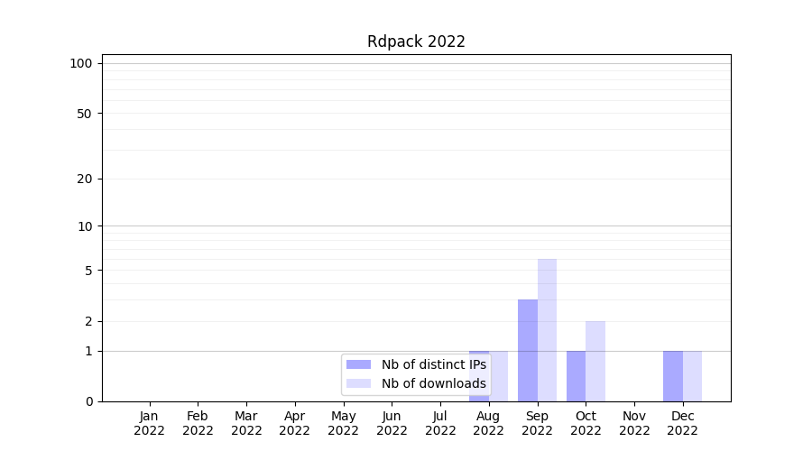 Number of downloads for annotation package Rdpack, year by year, from 2025 back to 2014 (years with no downloads are omitted):