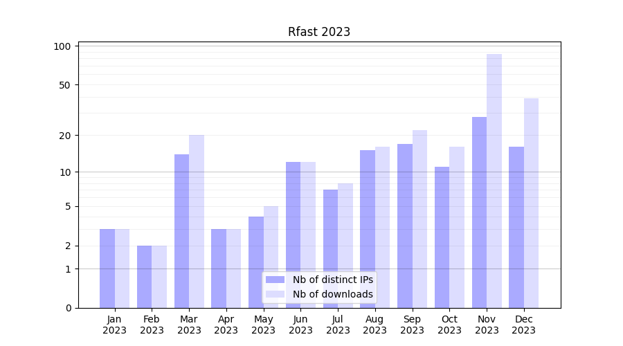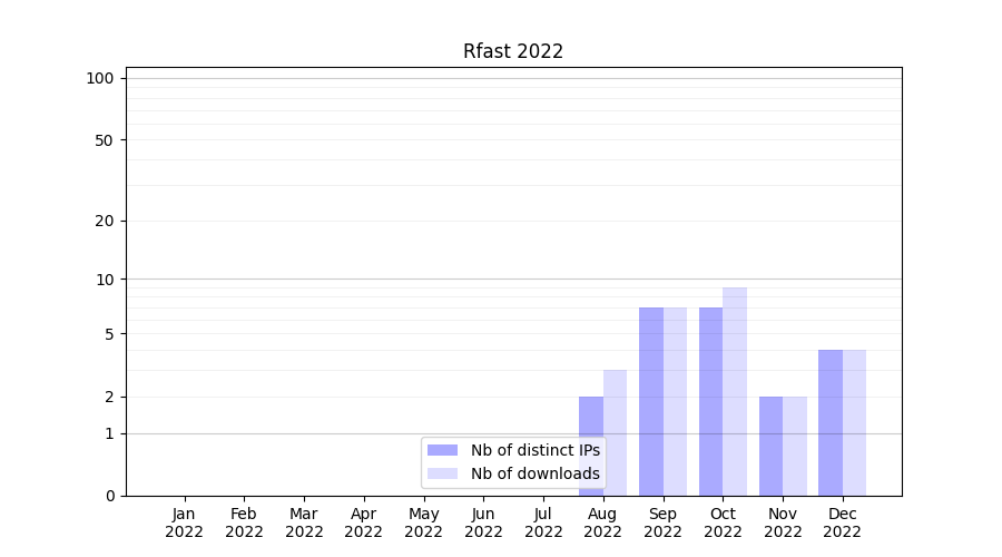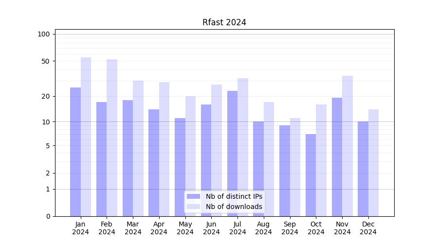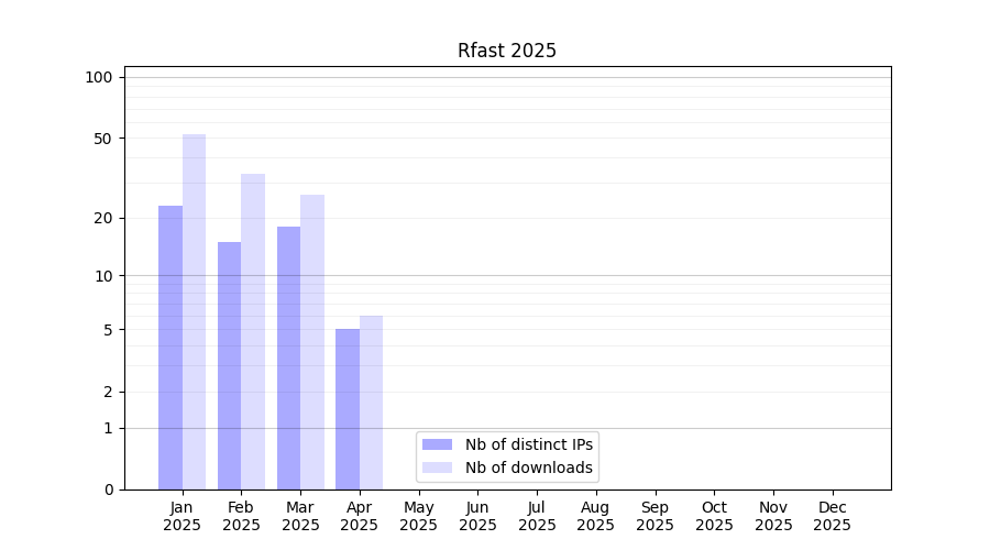 Number of downloads for annotation package Rfast, year by year, from 2025 back to 2014 (years with no downloads are omitted):