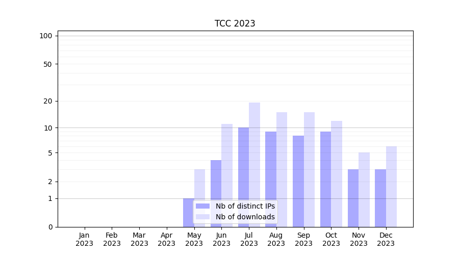 Number of downloads for annotation package TCC, year by year, from 2025 back to 2014 (years with no downloads are omitted):