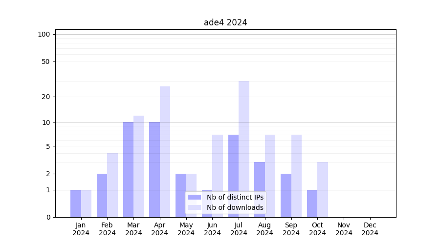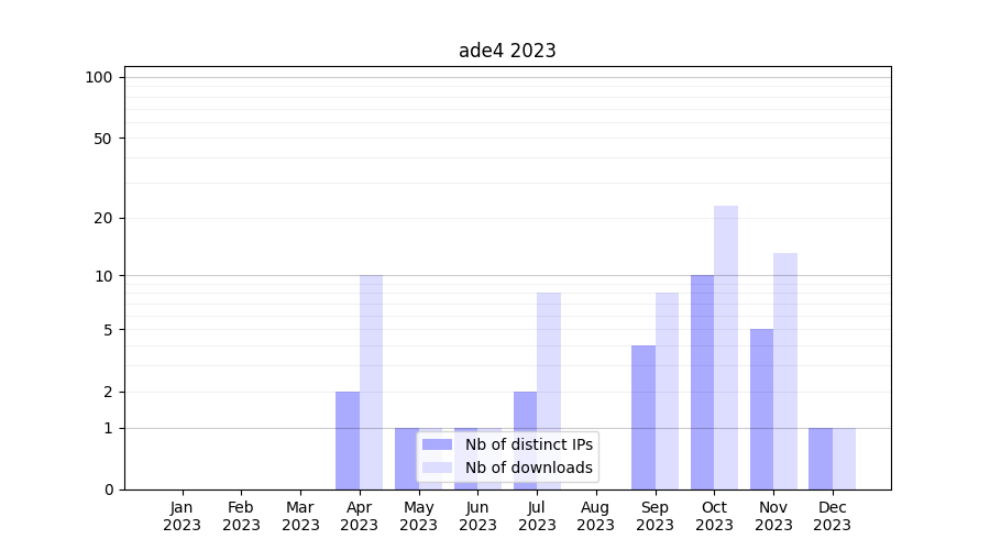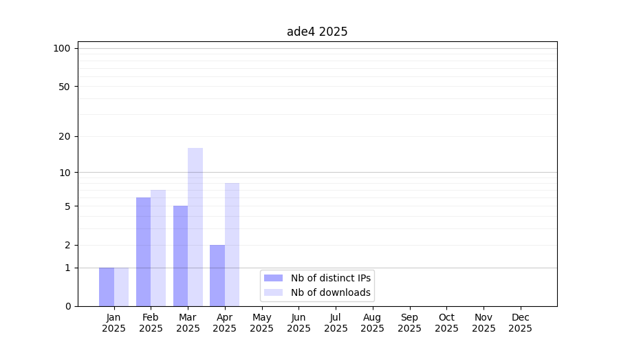 Number of downloads for annotation package ade4, year by year, from 2025 back to 2014 (years with no downloads are omitted):
