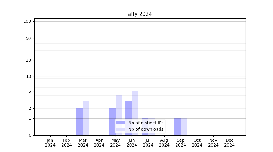 Number of downloads for annotation package affy, year by year, from 2025 back to 2014 (years with no downloads are omitted):