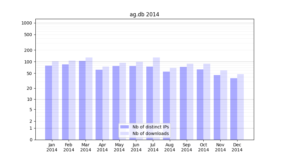 Number of downloads for annotation package ag.db, year by year, from 2025 back to 2014 (years with no downloads are omitted):