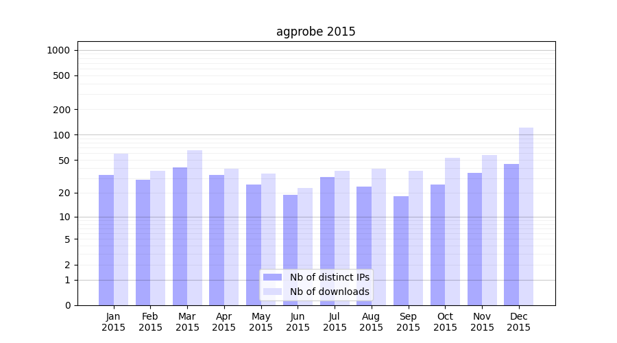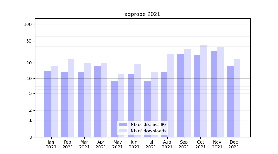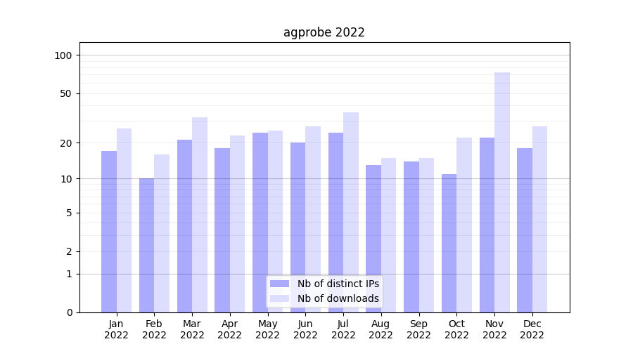 Number of downloads for annotation package agprobe, year by year, from 2025 back to 2014 (years with no downloads are omitted):