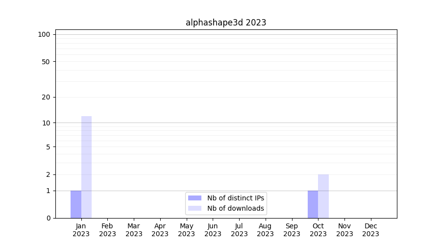 Number of downloads for annotation package alphashape3d, year by year, from 2025 back to 2014 (years with no downloads are omitted):