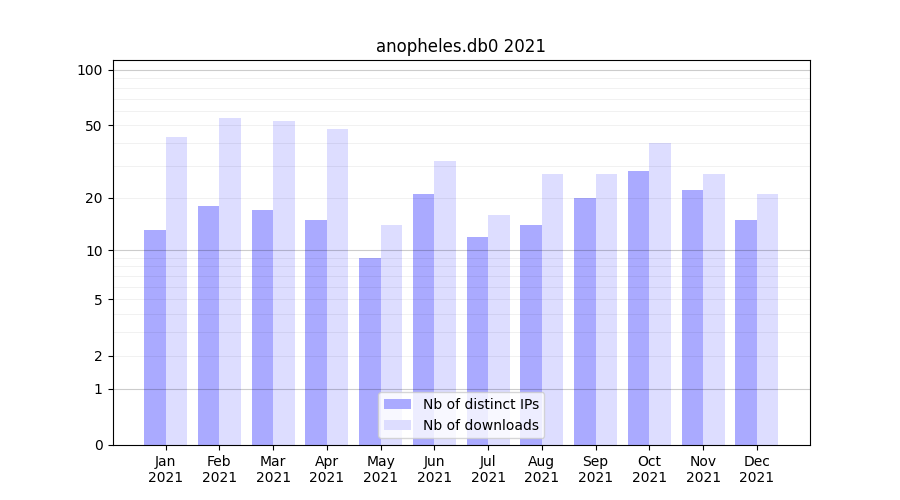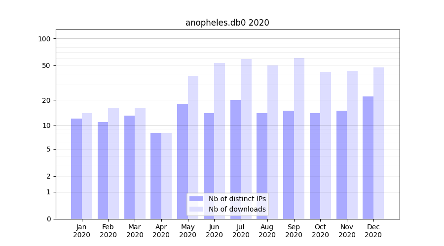 Number of downloads for annotation package anopheles.db0, year by year, from 2025 back to 2014 (years with no downloads are omitted):