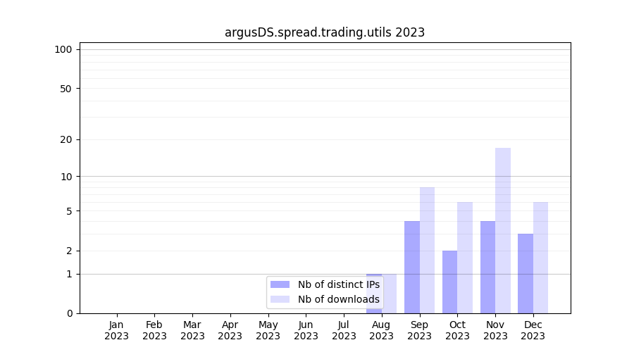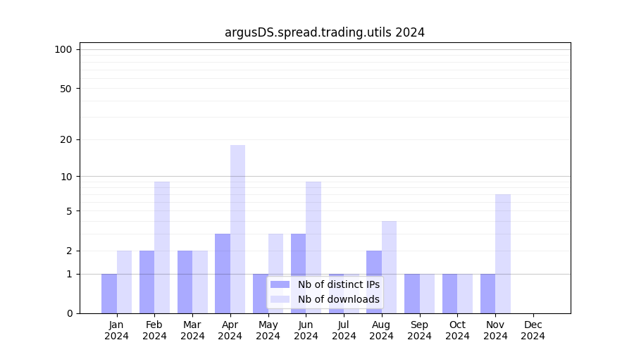 Number of downloads for annotation package argusDS.spread.trading.utils, year by year, from 2025 back to 2014 (years with no downloads are omitted):