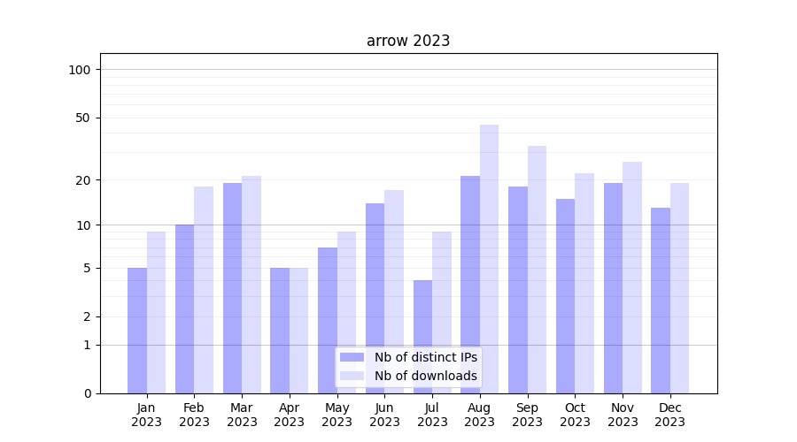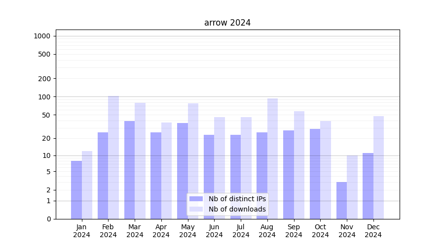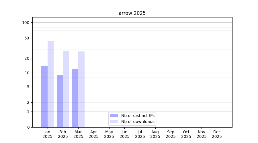 Number of downloads for annotation package arrow, year by year, from 2025 back to 2014 (years with no downloads are omitted):