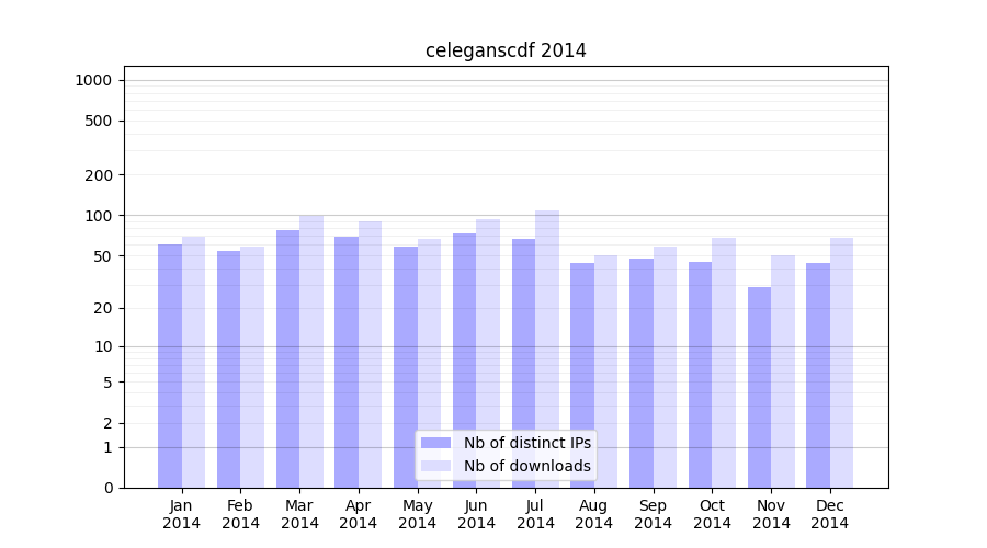 Number of downloads for annotation package celeganscdf, year by year, from 2025 back to 2014 (years with no downloads are omitted):