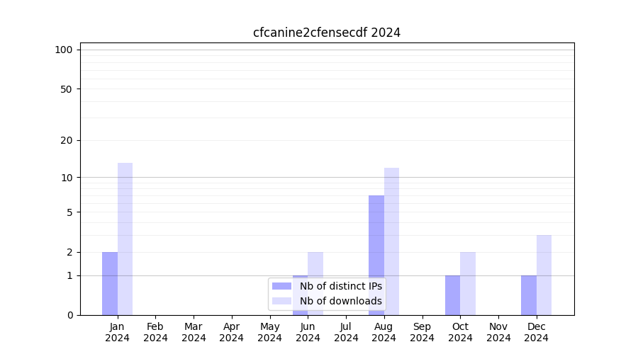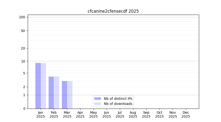 Number of downloads for annotation package cfcanine2cfensecdf, year by year, from 2025 back to 2014 (years with no downloads are omitted):