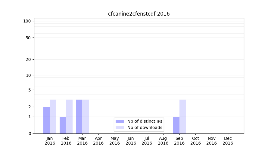 Number of downloads for annotation package cfcanine2cfenstcdf, year by year, from 2025 back to 2014 (years with no downloads are omitted):