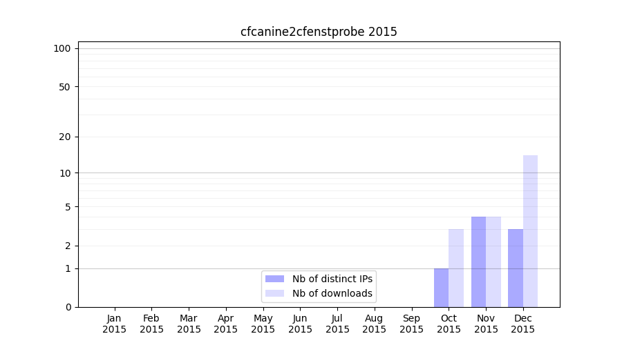 Number of downloads for annotation package cfcanine2cfenstprobe, year by year, from 2025 back to 2014 (years with no downloads are omitted):