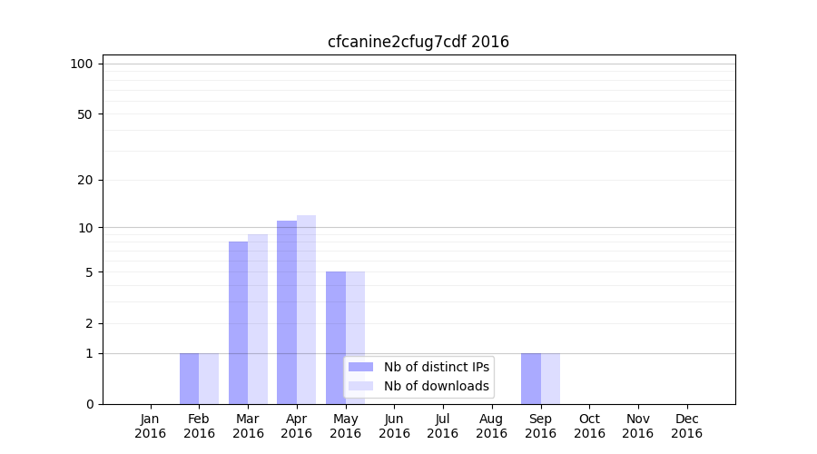 Number of downloads for annotation package cfcanine2cfug7cdf, year by year, from 2025 back to 2014 (years with no downloads are omitted):